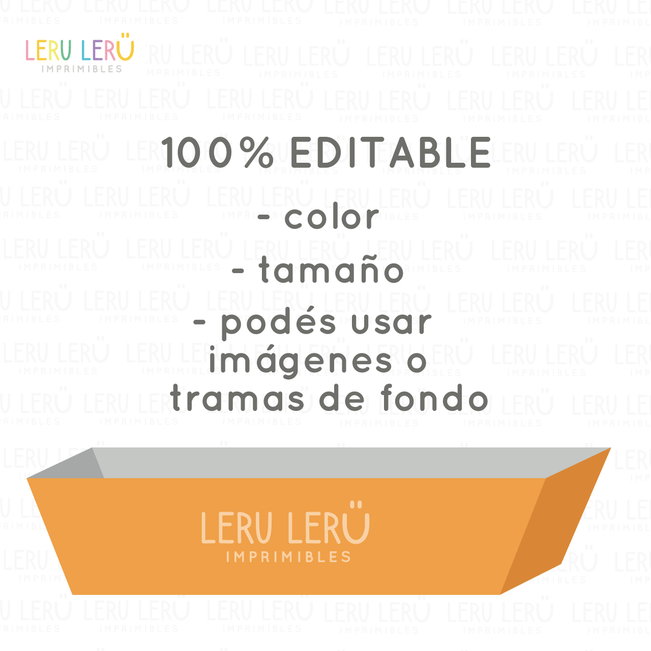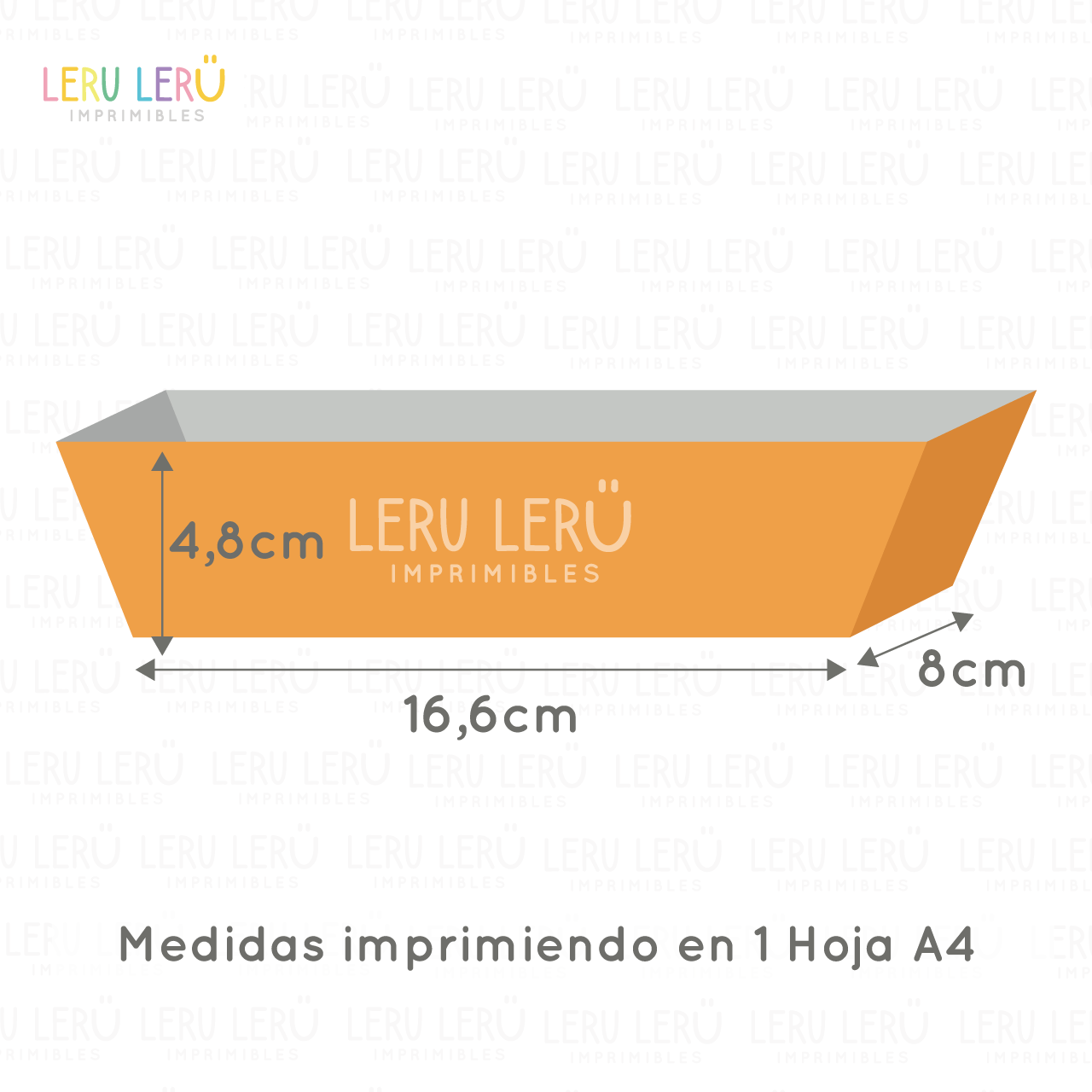 – 1 modelo editable de bandeja costados inclinados (16,6x8x4,8cm), configurado para imprimir en 1 hoja A4.