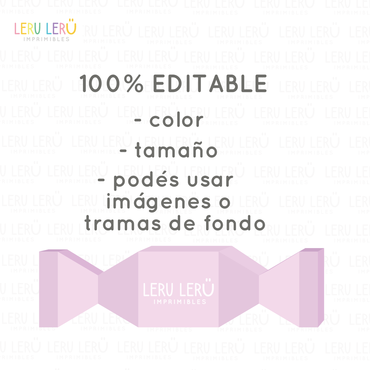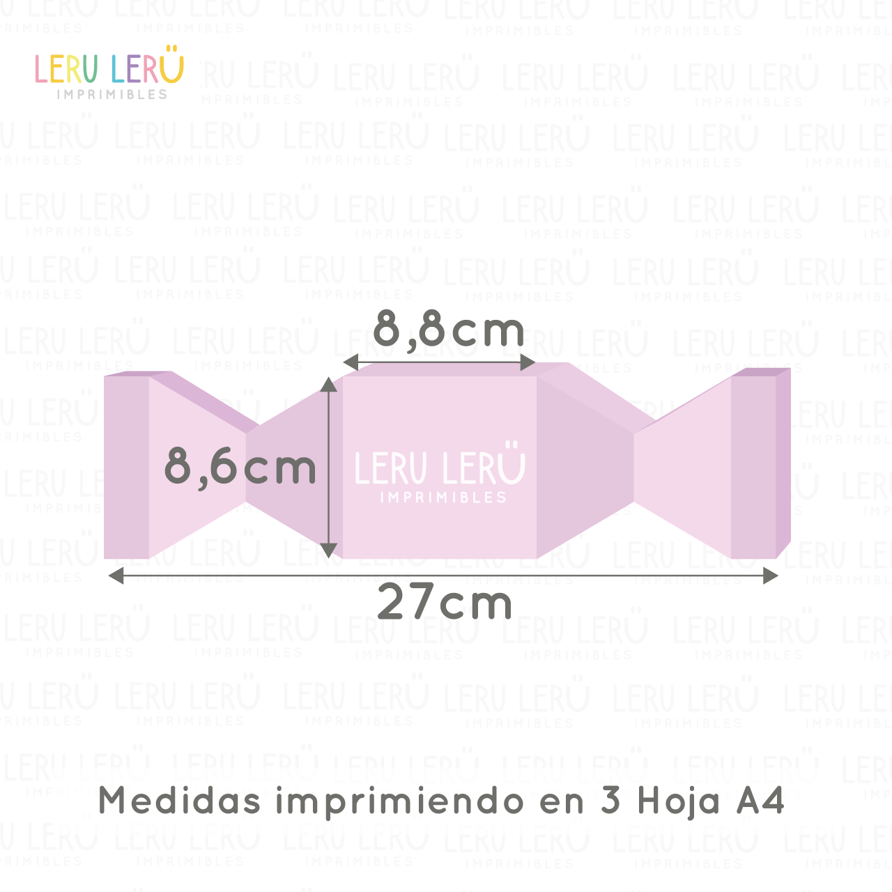 – 3 tamaños de caja caramelo, vienen configurados en hoja a4 (para imprimir en una, dos y tres hojas, también se puede modificar la pagina e imprimir en a3). Las medidas son las que se observan en las imágenes.