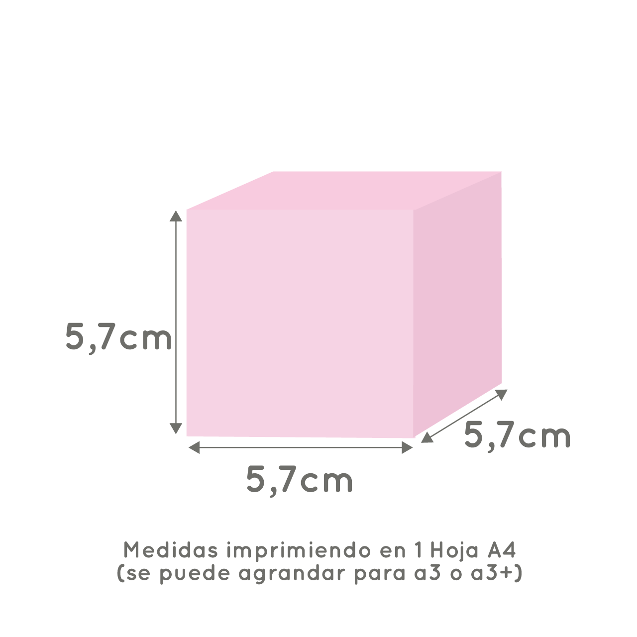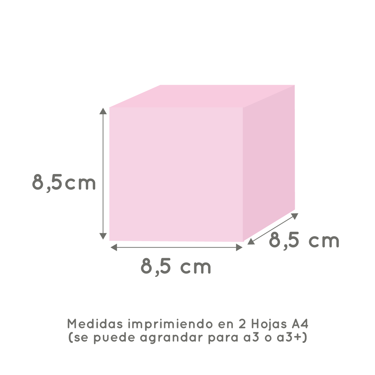 – 1 modelo editable de caja cubo, configurado para imprimir en una hoja A4, en 2 hojas A4 y en 4 hojas a4.