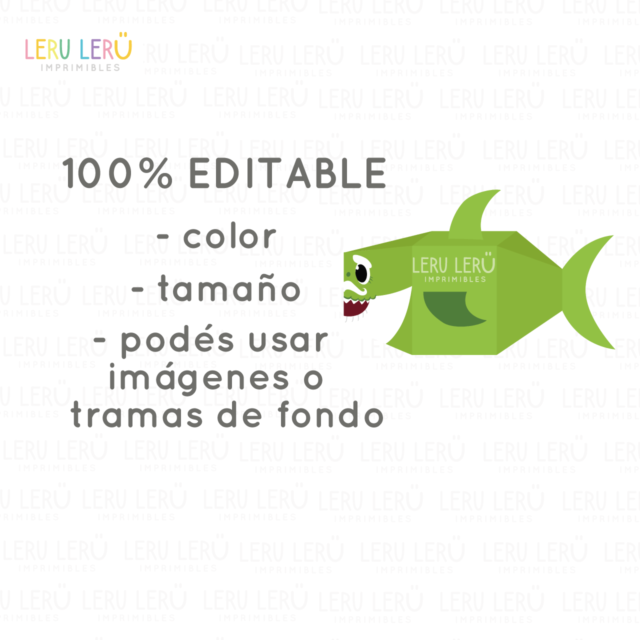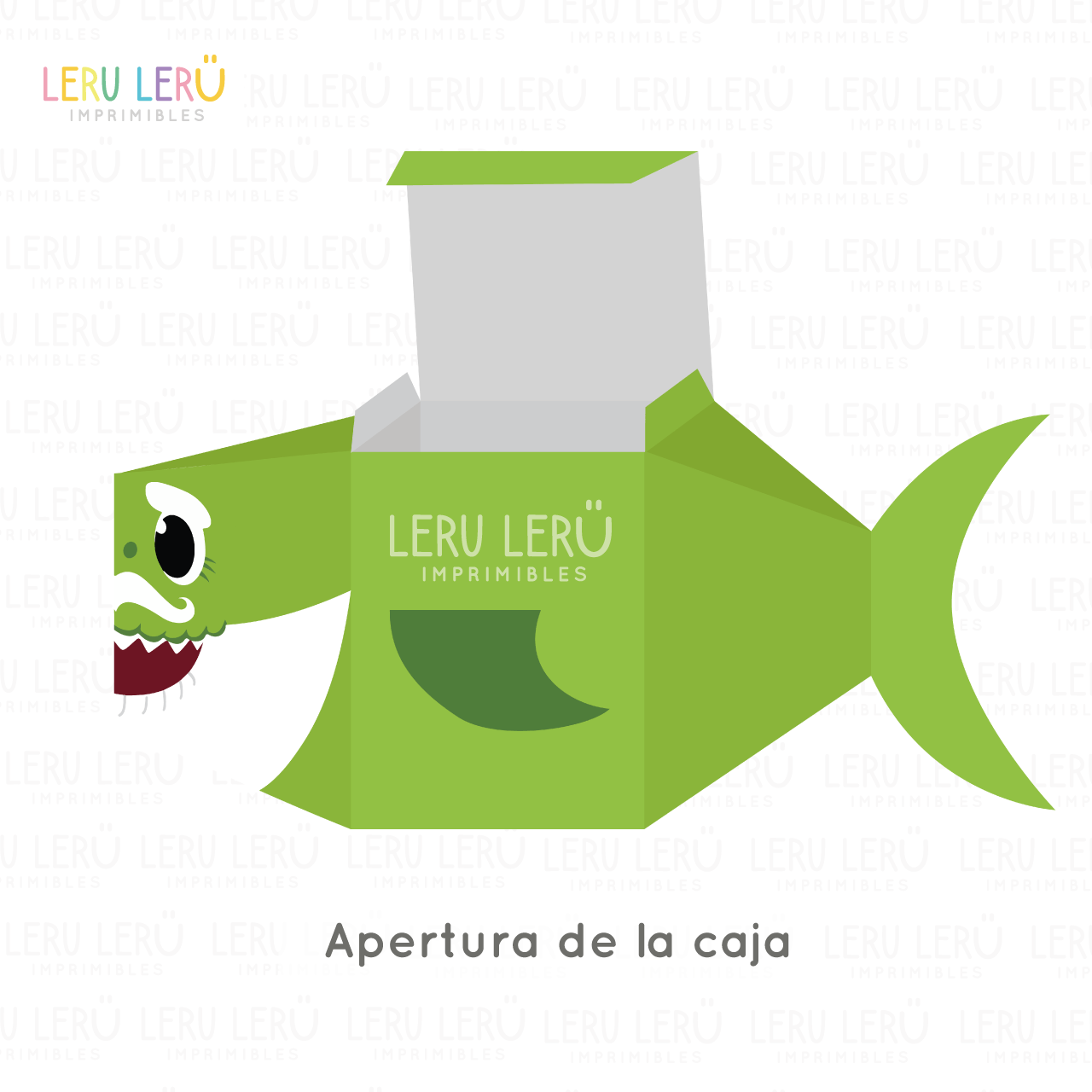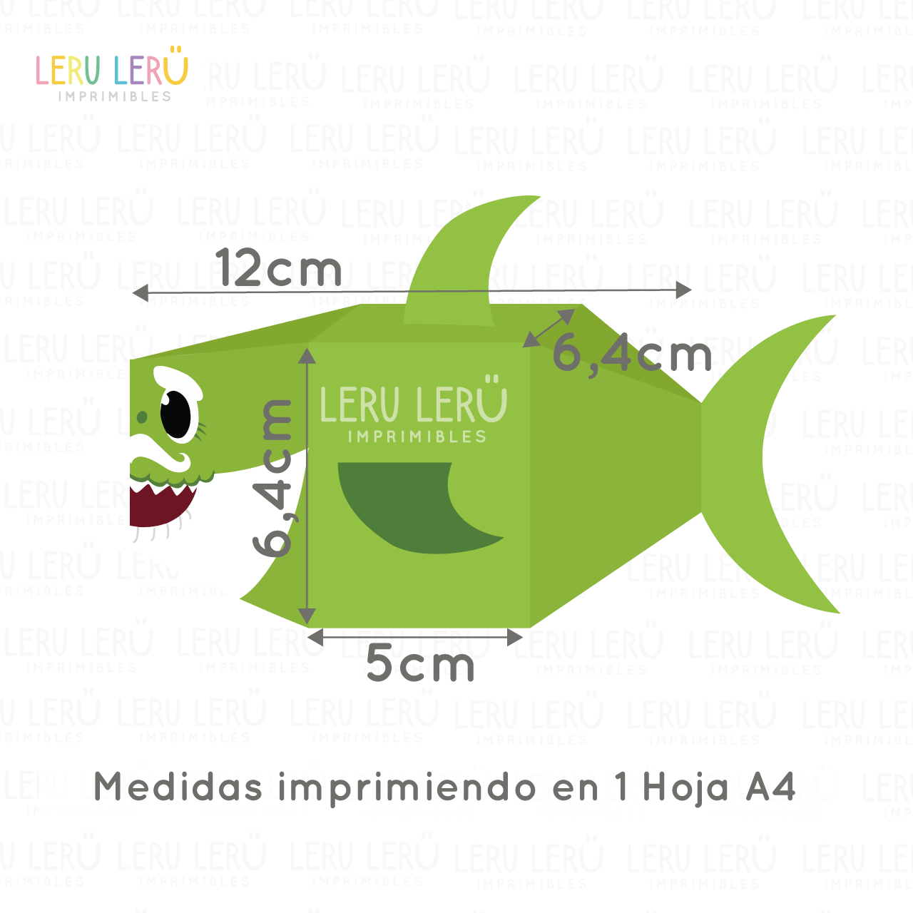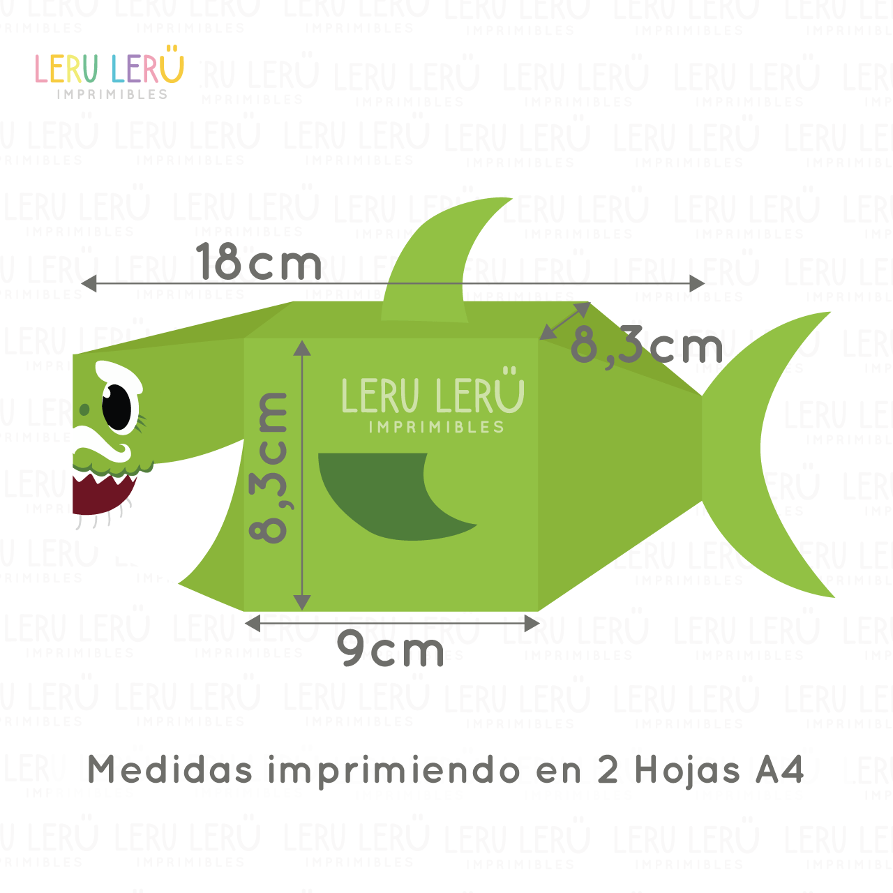 – 1 modelo de caja abuelo tiburón, viene configurada para imprimir en 1 y 2 hojas a4. Las medidas son las que se ven en las imágenes.