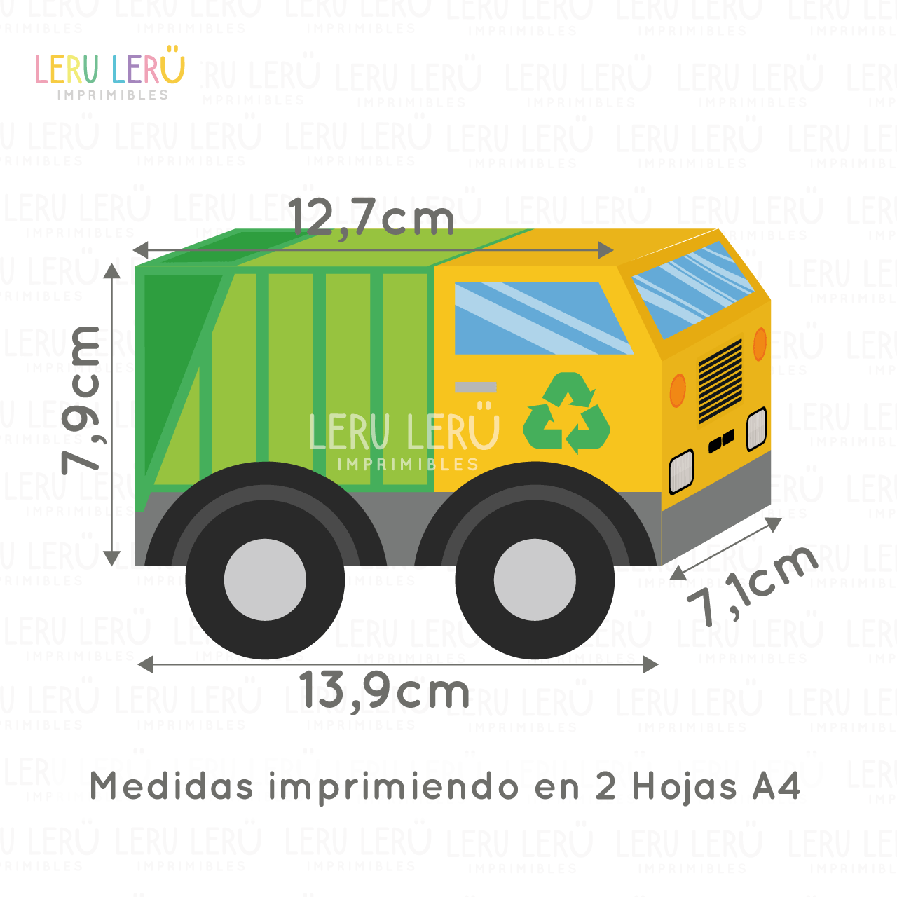 – 1 modelo de caja de camión recolector de basura, viene configurada para imprimir en 1, 2 y 3 hojas a4. Las medidas son las que se ven en las imágenes.