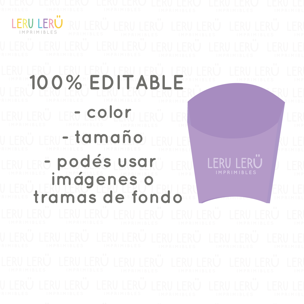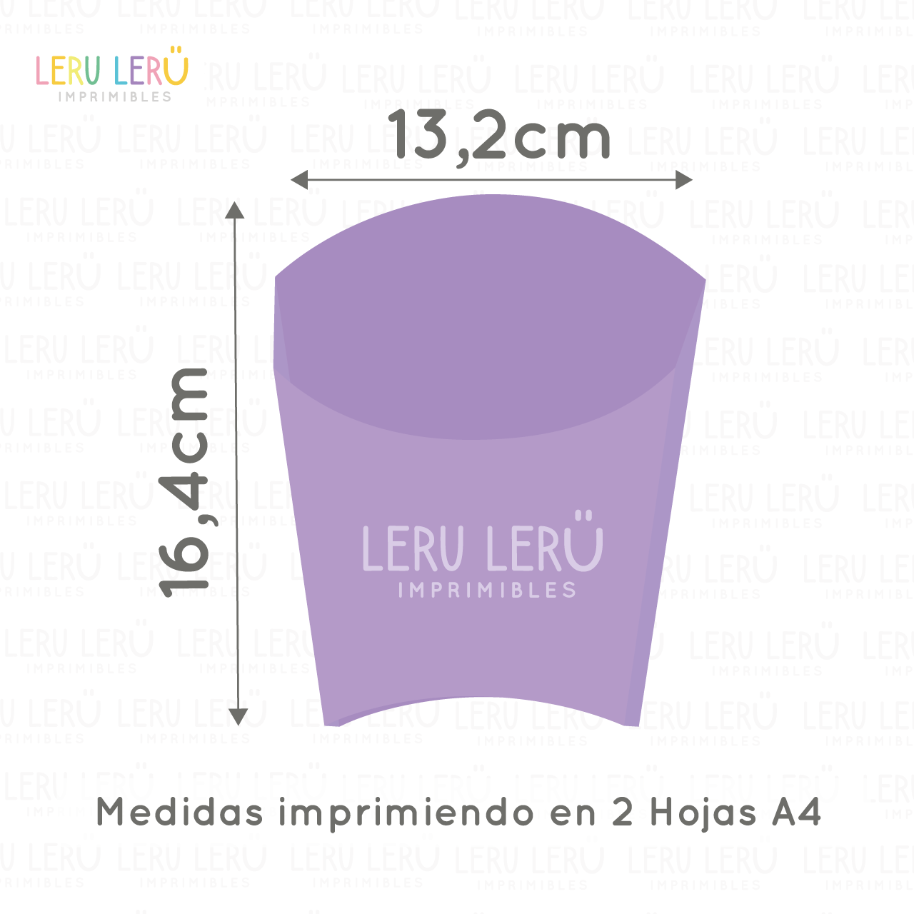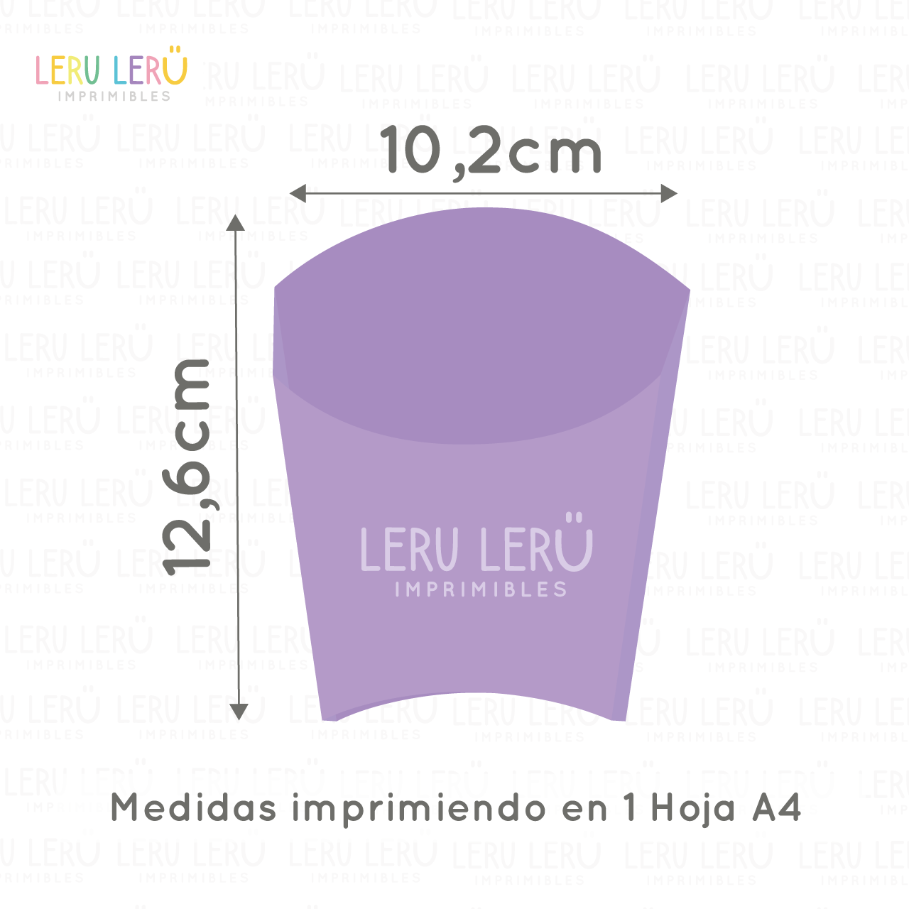 – 2 tamaños de caja de papas fritas, vienen configurados en 1y 2 hojas a4 (también se puede modificar la pagina e imprimir en a3). Las medidas son las que se observan en las imágenes.
